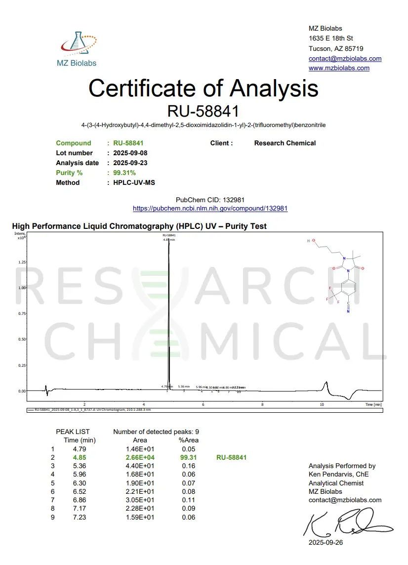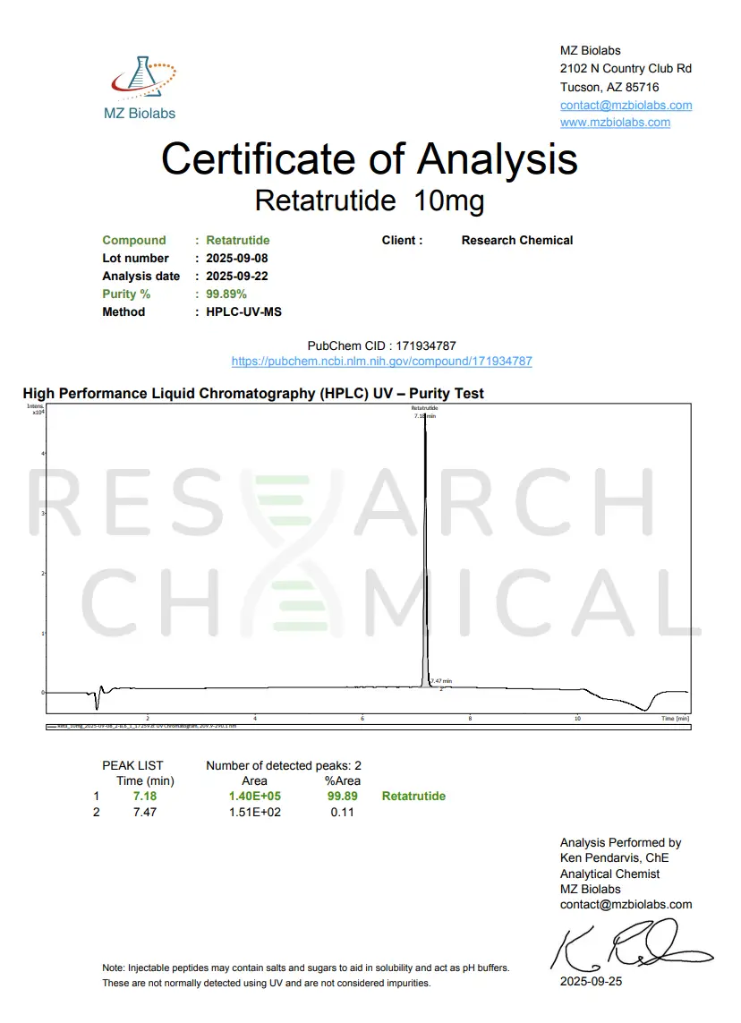 For more details, you can contact our third-party laboratory, MZ Biolabs directly to verify the results firsthand. As with any research chemical supplier, always review key information on the COA, such as the product name, testing date, purity levels, and laboratory accreditation. This ensures you’re working with accurate, high-quality products. Transparency and quality control are essential, so always check these critical findings before proceeding with your research.