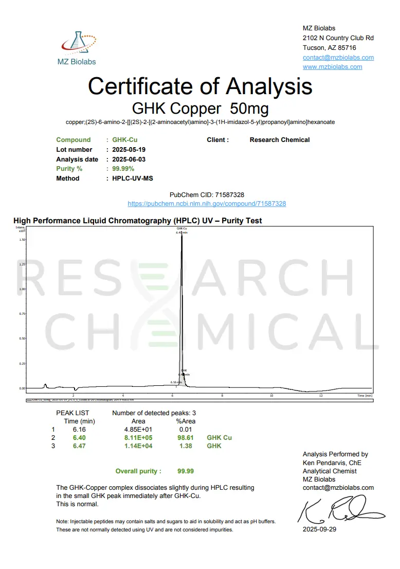 Each batch of GHK-Cu is independently third-party tested to verify identity and purity, supporting accuracy and reproducibility in scientific research applications.