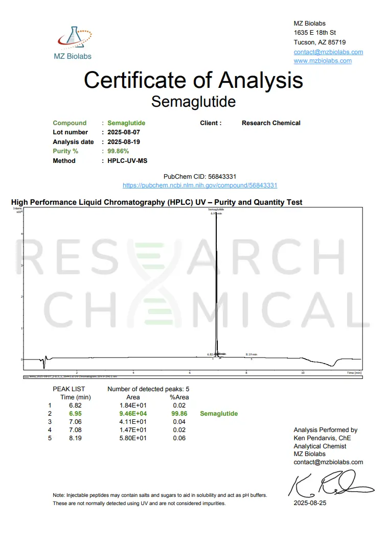 Research Chemical products are third-party tested by MZ Biolabs, an independent laboratory based in Arizona. Each batch is analyzed to ensure accuracy, purity, and that all specifications are met.
