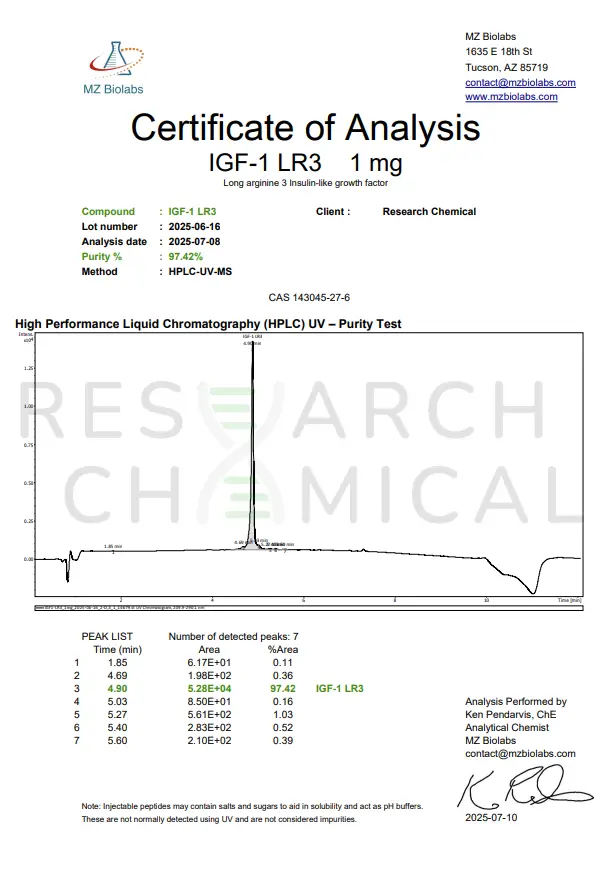 Each batch of IGF-1 LR3 is independently third-party tested to verify identity and purity, supporting accuracy and reproducibility in scientific research applications.