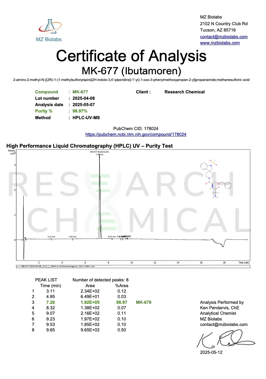 Each batch of Liquid MK-677 is independently third-party tested to verify identity and concentration, supporting accuracy and reproducibility in scientific research applications.
