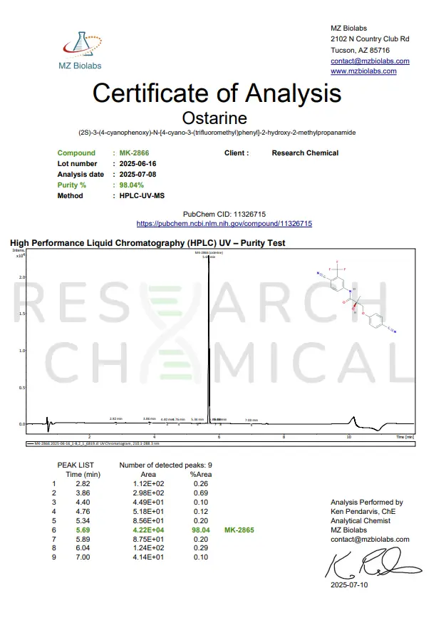 Research Chemical products are third-party tested by MZ Biolabs, an independent laboratory based in Arizona. Each batch is analyzed to ensure accuracy, purity, and that all specifications are met.