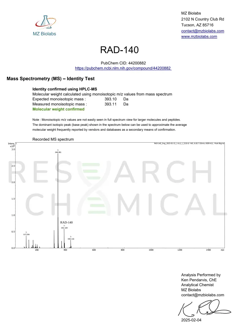 Each batch of RAD-140 is verified through third-party analysis to ensure purity and chemical accuracy. RAD-140 is not approved for human consumption, and its use is restricted to laboratory research purposes only.