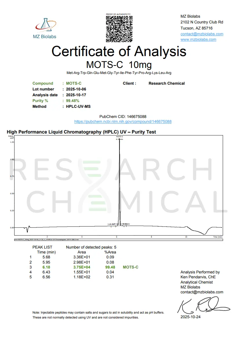 Each batch of MOTS-c is independently third-party tested to verify identity and purity, supporting accuracy and reproducibility in scientific research applications.
