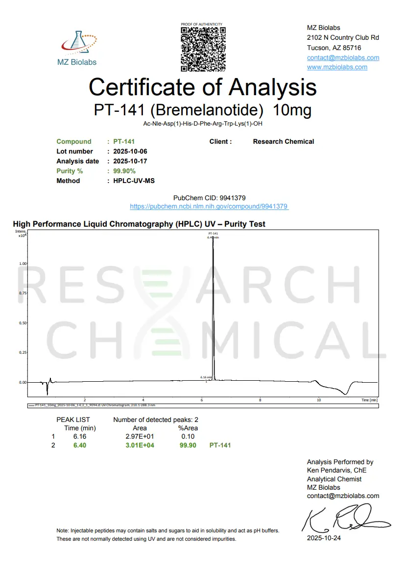 Each batch of PT-141 is independently third-party tested to verify identity and purity, supporting accuracy and reproducibility in scientific research applications.