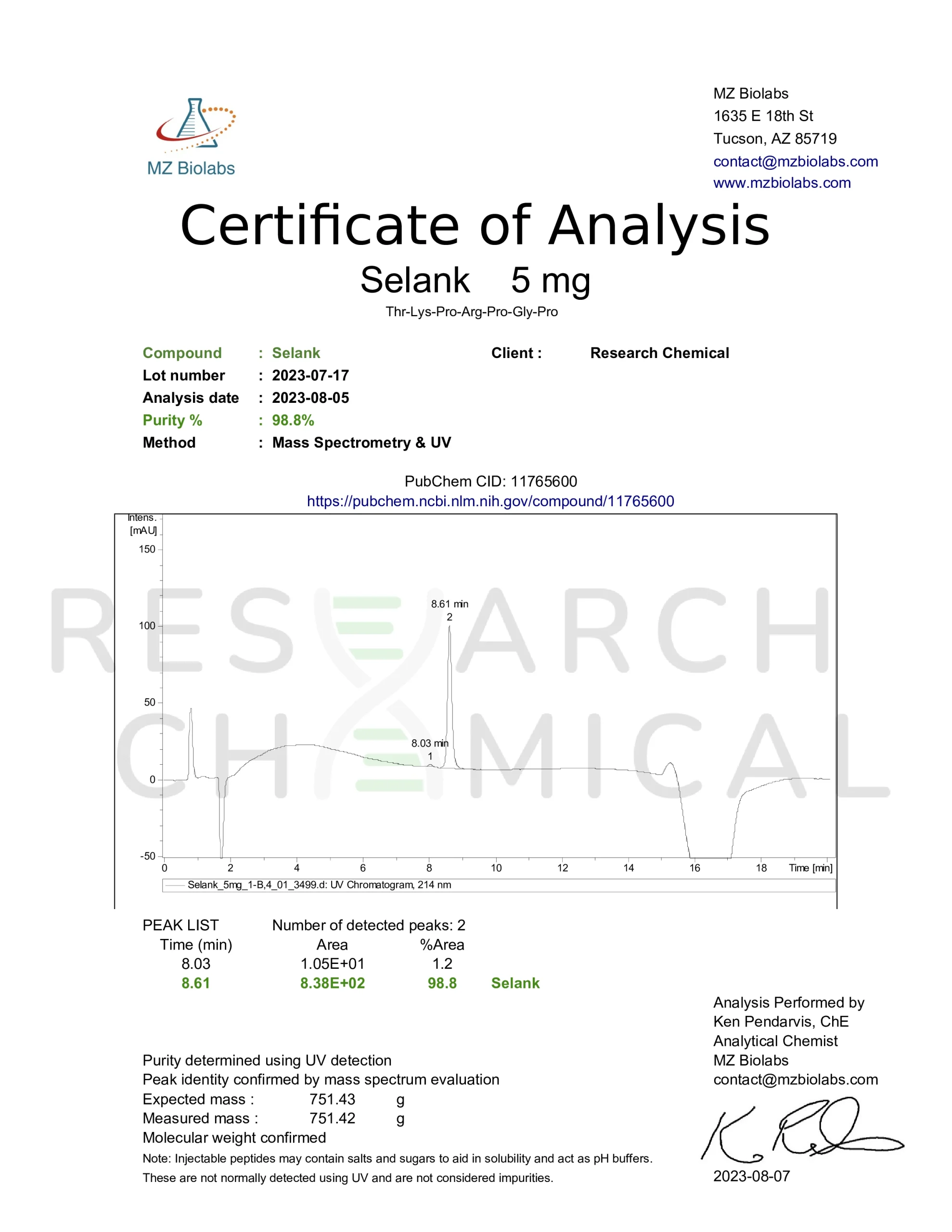 Research Chemical products are third-party tested by MZ Biolabs, an independent laboratory based in Arizona. Each batch is analyzed to ensure accuracy, purity, and that all specifications are met.