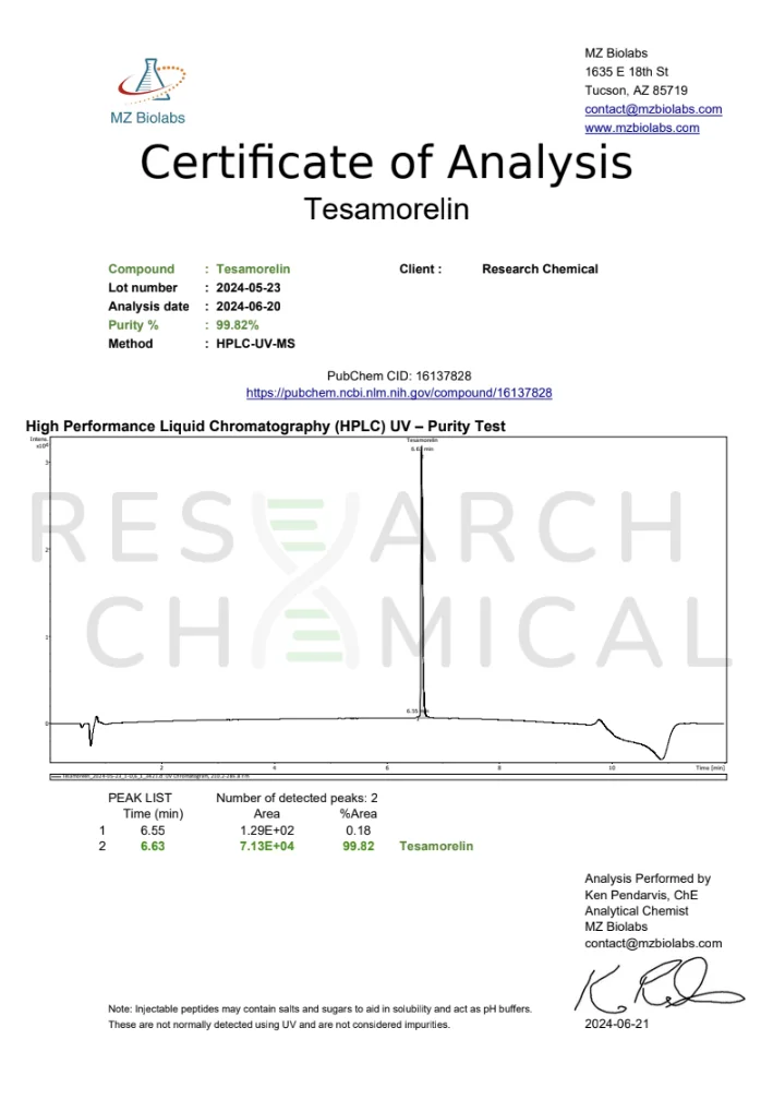The purity of Tesamorelin is verified through high-performance liquid chromatography (HPLC) testing conducted by accredited US laboratories. Each batch comes with a Certificate of Analysis (COA).