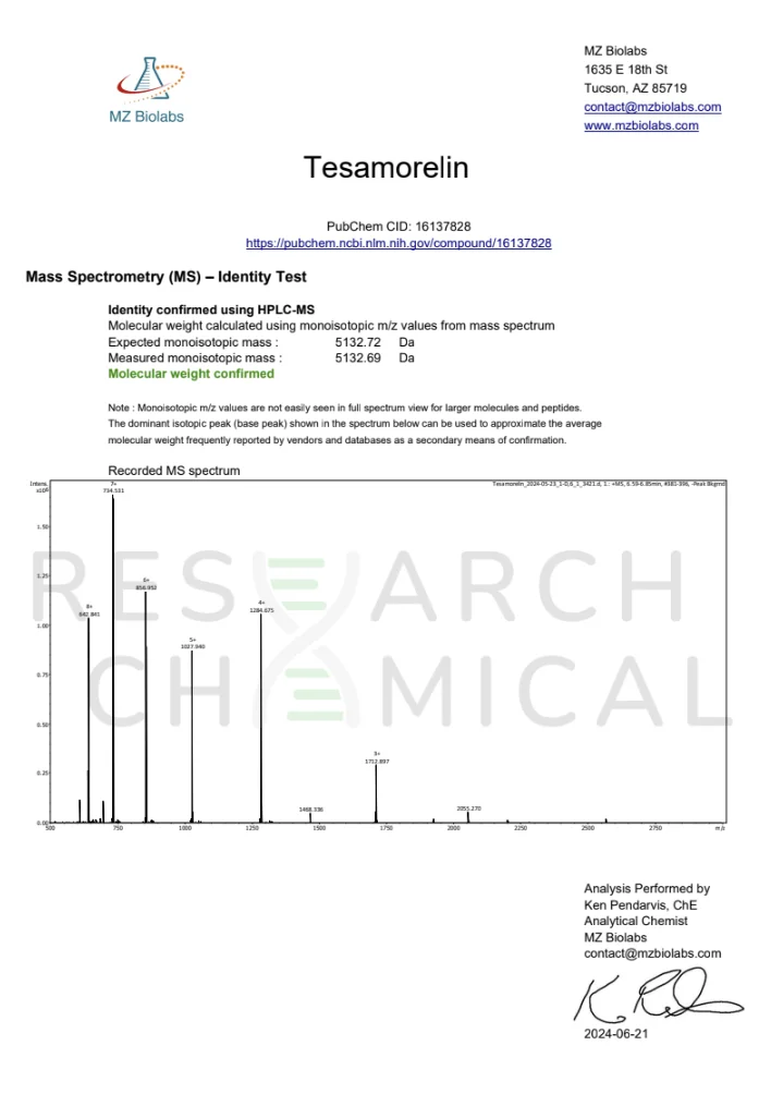 Research Chemical products are third-party tested by MZ Biolabs, an independent laboratory based in Arizona. Each batch is analyzed to ensure accuracy, purity, and that all specifications are met.